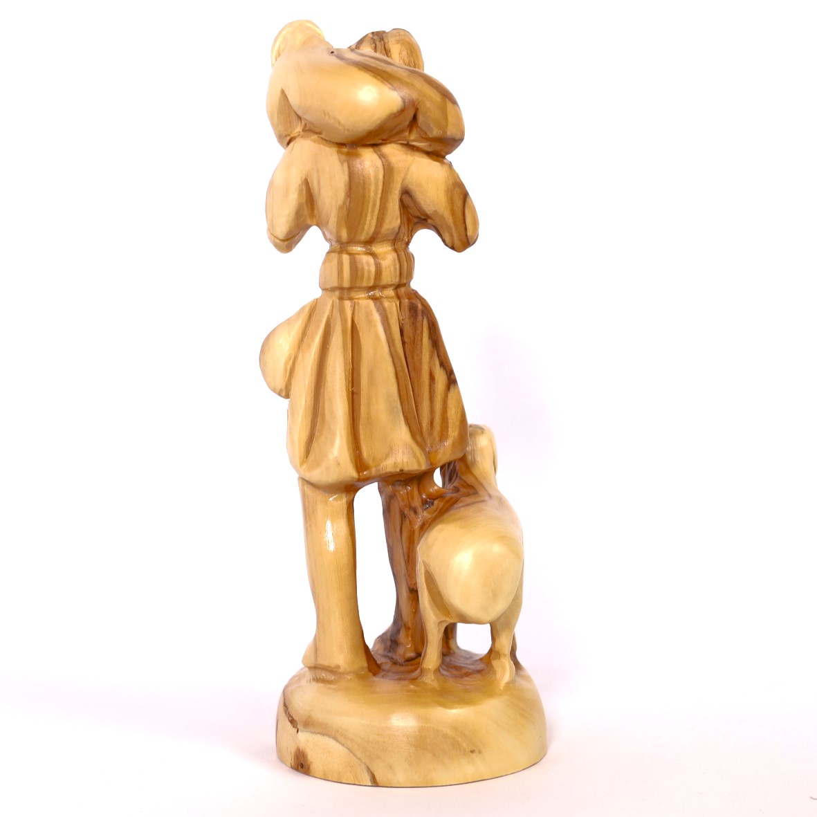 Embrace the beauty of Bethlehem with our elegant shepherd figurine, skillfully crafted from olive wood. This exquisite piece captures the tender imagery of a shepherd carrying a sheep on his shoulders, symbolizing care and guidance. With your purchase, you’re not only acquiring a timeless work of art but also providing support to craftsmen in the Holy Land.